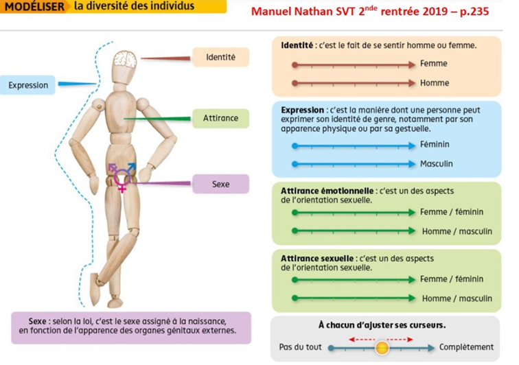 C’est sibyllin. Je m’imagine élève de seconde. Un curseur me propose d’évaluer mon degré d’attirance émotionnelle vers Femme / féminin ; un autre vers Homme / masculin. Ça se complique. L’attirance peut-elle changer selon les années, voire du matin au soir ? Le manuel ne le dit pas. Enfin arrive le Sexe, en dernier. Le mot ne pointe que sur l’entrejambe du mannequin où figure une combinaison de trois sigles : mâle et femelle (qui sont bien connus) mais aussi un sigle composite, comme un troisième sexe. Lisons la légende : « Selon la loi, c’est le sexe assigné à la naissance en fonction de l’apparence des organes génitaux externes ».